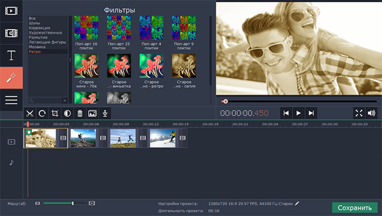 В коллекции Movavi Video Suite вас ждет более 60 визуальных эффектов:- Ретро-фильтры