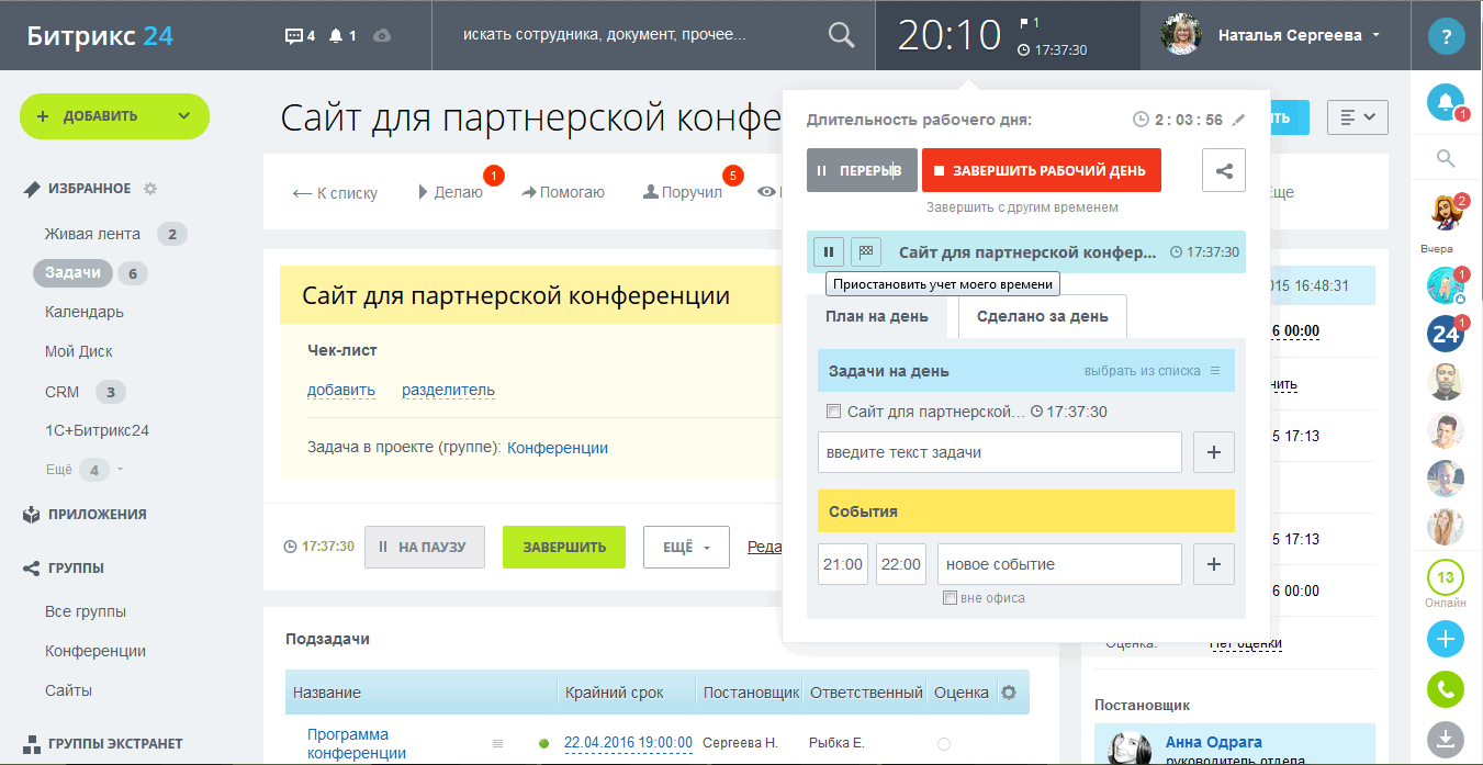Облачный сервис для большой компании, позволяющий автоматизировать внутренние бизнес-процессы, например, документооборот. Тариф включает систему учета рабочего времени, формирующей отчеты по рабочему времени для каждого сотрудника и учитывающей затраты времени на выполнение задач. Вы можете автоматизировать свои собрания и планерки: рассылать автоматом приглашения, ставить в встречи в календари сотрудников, назначать задачи и отмечать выполненные в протоколе.Возможности